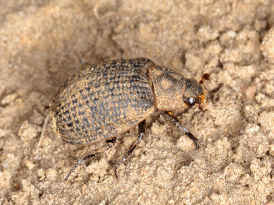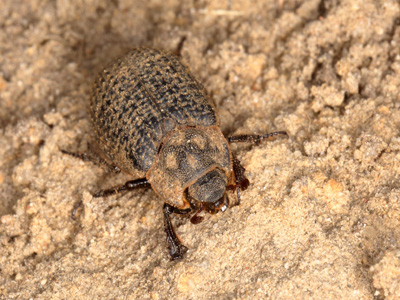 Merkmale: Körper 8 - 10 mm, kompakt, aufgewölbt. Farbe schwarz bis schwarzbraun. Oberseite mit erhabenen Streifen und Borstenbüscheln in den Zwischenräumen. Behaarung an den Rändern der Flügeldecken kurz. Fühler rostrot. Lebensweise: Meist auf trockenen, sandigen Böden. Habitate sind u.a. lichte Kiefernwälder, Trockenrasen, Ruderalflächen, Sandgruben, landwirtschaftliche Flächen. Findet sich an Tierkadavern, Federn und Fellresten. Auch in und an Fuchsbauen. Von März bis Oktober. Vorkommen und Gefährdung: In Brandenburg und Oderbruch wahrscheinlich verbreitet und nicht gefährdet. Beispielnachweis: 03.06.2018 Mallnower Hänge (K. Neumann)
