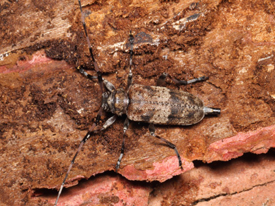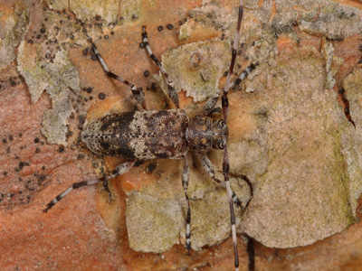 Acanthocinus griseus (FABRICIUS, 1792) - Braunbindiger-Zimmerbock Biologie: Der 9 - 12 mm große Käfer entwickelt sich bevorzugt in Kiefer (Pinus-Arten) aber auch in Fichte (Picea abies). Die Entwicklungsdauer ist wahrscheinlich zweijährig unter der Rinde toter oder absterbender Äste und Stämme. Die Imagines erscheinen von Juni bis September. Sie sind dämmerungs- und nachtaktiv. A. g. bevorzugt strukturreiche Nadelwälder, findet sich aber auch in Kiefernforsten. Vorkommen und Gefährdung: In den Brandenburger Kiefern- und Mischwäldern weitverbreitet und zunehmend häufiger. Beispielnachweise: 20.07.2017 Potsdam/Wildpark/P, 19.08.2018 Potsdam-Ravensberge/P, 26.05.2022 Döberitzer Heide/HVL,