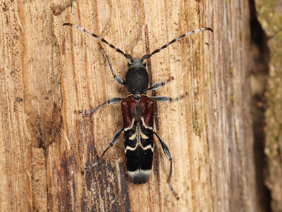 Anaglyptus mysticus (LINNAEUS, 1758) - Zierbock, Dunkler Zierbock, Geheimnisvoller Zierbock Biologie: Der 6 - 14 mm große Käfer entwickelt sich in trockenen Stubben und Ästen von Laubbäumen (u. a. Acer, Crataegus, Quercus, Prunus, Rosa, Tilia, Ulmus). Teilweise akrodentrisch. Die Entwicklungsdauer ist mindestens zweijährig. Die tagaktiven Imagines erscheinen von April bis August auf Blüten. A. m. findet sich in Laubwäldern und Parks. Vorkommen und Gefährdung: Wird in Brandenburger vielerorts und häufig nachgewiesen. Beispielnachweise: 30.05.2014 Sophienthal/MOL, 14.05.2022 Schöbendorfer Busch/TF, 15.05.2022 Brieselang/HVL, 16.05.2022 Rabenstein/PM |
