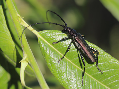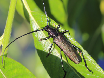 Aromia moschata (LINNAEUS, 1758) - Moschusbock Biologie: Der 13 - 35 mm große Käfer ist oligophag und entwickelt sich vorwiegend in verschiedenen Weidenarten (Salix spp.), seltener auch in anderen Laubbäumen. Die Entwicklungsdauer ist dreijährig. Die tagaktiven Imagines erscheinen von Juni bis August auf Blüten und am Brutholz. A. m. findet sich in Flussauen, an Gewässerufern, in feuchten Wäldern aber auch Parks und Gärten. Der Artname leitet sich von einem charakteristisch riechenden Sekret ab, dass der Käfer absondert. Vorkommen und Gefährdung: Ist in Brandenburg weitverbreitet. Die Art steht auf der Vorwarnliste (Kategorie V, RLD 2021). Beispielnachweise: 01.07.2015 Park Sanssouci/P., 11.06.2022 Schöbendorfer Busch/TF, 03.07.2022 Altranft/MOL |