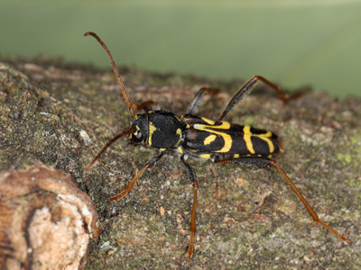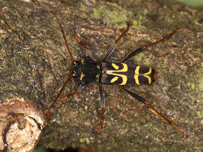 Clytus tropicus (PANZER, 1795) - Wendekreis-Widderbock Biologie: Der 10 - 20 mm große, polyphage Käfer entwickelt sich in absterbenden Ästen vorwiegend im Kronenbereich sowie in der Stammregion verschiedener Laubbäume besonders Quercus. Die tagaktiven Imagines erscheinen von Mai bis Juli. Die Tiere finden sich an den Brutbäumen oder an Eichenklaftern. C. t. besiedelt wärmebegünstigte Laubwälder, Hartholzauen und Parks. Vorkommen und Gefährdung: In Brandenburg verbreitet aber selten bis sehr selten. Die Art wird in Deutschland als gefährdet eingestuft (Kategorie 3, RLD 2021). Beispielnachweise: 14.06.2012 Potsdam-Park Sanssouci/P, 11.05.2023 Potsdam-Pirschheide/P