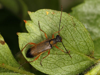 Grammoptera ustulata (SCHALLER, 1783) - Eichen-Blütenbock Biologie: Der 5 - 9 mm große, polyphage Käfer entwickelt sich in dünnen, verpilzten Zweigen und Ästen verschiedener Laubbäume z. B. Quercus und Tilia. Teilweise akrodentrische Art. Die Entwicklungsdauer ist wahrscheinlich einjährig. Die tagaktiven Imagines haben eine Hauptflugzeit von April bis Juni. Sie finden sich am Brutholz und sehr häufig auf Blüten (u. a. Crataegus, Quercus, Cornus). Thermophile Art. Vorkommen und Gefährdung: In Brandenburg verbreitet und relativ häufig. In wärmebegünstigten Laub- und Mischwäldern, Parks. Die Art gilt in Deutschland als ungefährdet (RLD 2021). Beispielnachweise: 19.05.2017 Lindstedt/P, 05.05.2018 Wildpark/P, 08.05.2022 Oderberge Lebus/MOL, 14.05.2022 NSG Schöbendorfer Busch/TF, 12.05.2022 NSG Rabenstein/PM |