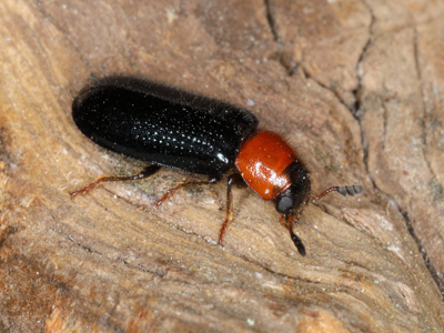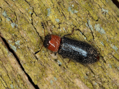 Dermestoides sanguinicollis (FABRICIUS, 1787) Biologie: Der 7 - 9 mm große Käfer entwickelt sich in Alteichen, wo die Larven in den Bohrgängen unterschiedlicher xylobionter Käfer räuberisch leben. Die Imagines finden sich oft an den rindenfreien Bereichen älterer, vom Heldbock (Cerambyx cerdo) besiedelter Eichen, aber auch an frischen Schnittstellen gefällter Bäume in Waldungen ohne Heldbockbesatz.Thermophile Art. Vorkommen und Gefährdung: In Brandenburg verbreitet aber selten bis sehr selten. Die Art wird in Deutschland als vom Aussterben bedroht eingestuft (Kategorie 1, RLD 2021). Beispielnachweise: 19.05.2016 Park Sanssouci/P, 01.05.2018 Wildpark/P, 15.05.2022 Forst Breedow/HVL, 25.06.2022 bei Rabenstein/PM |
