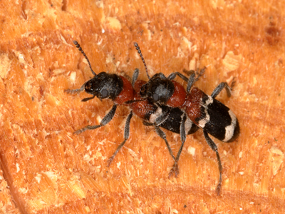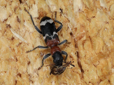 Thanasimus formicarius (LINNAEUS, 1758) - Gemeiner Ameisenbuntkäfer Biologie: Der 7 - 10 mm große Käfer entwickelt sich in Nadelhölzern aber auch in Laubbäumen. Imagines und Larven leben räuberisch und jagen verschiedene Insekten besonders Scolytinae. Die Imagines finden sich von März - August meist am Holz. Vorkommen und Gefährdung: In Brandenburg überall verbreitet und sehr häufig. Vorkommen in Nadel- und Mischwäldern. Beispielnachweise: 10.06.2018, 28.07.2018 Wildpark/P, 17.06.2022 Glindow/PM, 22.05.2022 Dippmannsdorf/PM, 25.06.2022 Rabenstein/PM, 23.06.2022 Preschener Mühlbusch/SPN |