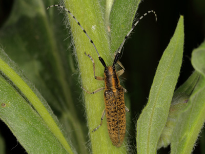 | Bärenklaubock, Distelbock Merkmale: Körperlänge 10 – 23 mm. Grundfarbe schwarz mit gelbbrauner bis weissgrauer, fleckenartiger Tomentierung. Heller Mittelstreifen auf dem Halsschild. Fühler weißgrau und schwarz geringelt. Literatur: Bense 1995, Klausnitzer et al. 2016 |