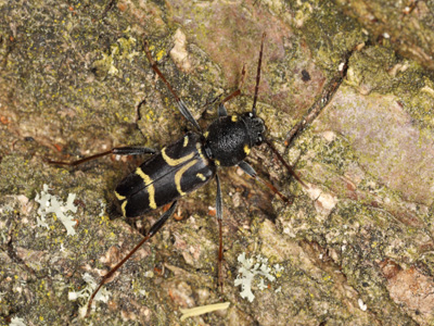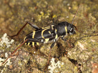 | Zierlicher Holzwespenbock Merkmale: Größe 7-14 mm. Schwarzer Körper mit braunen Antennen und Beinen. Flügeldecken schwarz mit gelben Streifen. Halsschild vorn und hinten mit kleinen gelben Flecken. Lebensweise: Entwicklung erfolgt in Holz und Rinde abgestorbener Äste und Zweigen von Eichen. Die Entwicklungzeit beträg zwei Jahre. Käfer erscheinen von Mai bis Anfang August auf Holzstämmen oder Reisig. Mitunter ist die Art auch auf Blüten zu finden. Vorkommen und Gefährdung: In Brandenburg ist die Art weit verbreitet und mäßig häufig. In RLBb als Kategorie 4-Art geführt. Im Oderbruch ist die Art nicht selten. Nachweise stammen u.a. von Gusow (2015), Reitweiner Sporn (2016), Dammabschnitt bei Sophiental (2017) sowie dem Sophientaler Polder (2018). Literatur: Weidlich 1992, Bense 1995, Klausnitzer et al. 2016, Esser 2017 |
