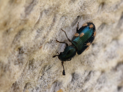 Blauer Kolbenbuntkäfer, Blauer Schinkenkäfer Lebensweise: Kosmopolit. An Aas, Knochen, Tierhäuten und sonstigen organischen Abfällen. Auch in Komposthaufen. Lebt räuberisch von Larven anderer Insekten. Käfer sind aktiv von April bis September. Vorkommen und Gefährdung: In Brandenburg wahrscheinlich nicht selten. Verbreitung im Oderbruch kaum untersucht. Beispielnachweise: 30.05.2014, bei Kienitz, 28.06.2015 Sophienthaler Polder (K. Neumann) |