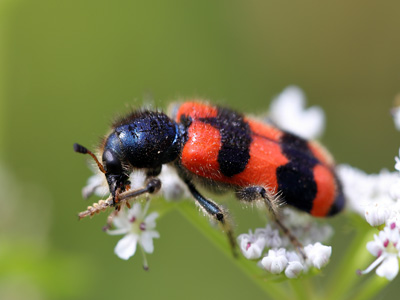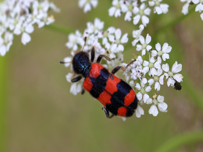 Gemeiner Bienenkäfer, Bienenwolf Lebensweise: Wärmeliebende Art. Trockene Wiesen, Waldränder, Parks. Käfer ernähren sich von Blütenpollen und Insekten. Entwicklung in Mauerbienennestern und Honigbienenstöcken. Larven sind räuberisch. Käfer erscheinen Mai bis Juli auf Doldenblüten. Vorkommen und Gefährdung: In Brandenburg verbreitet. Früher recht häufig, aktuell keine Häufigkeitsangaben. Im Oderbruch wenige Nachweise. Beispielnachweise: 28.06.2014 Sophienthaler Polder (K. Neumann) |