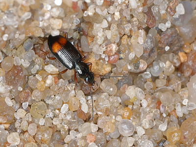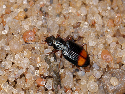 Grossfleck-Ahlenläufer Merkmale: Körper 4,5 - 5 mm, dunkelblau. Flügeldecken mit orangeroter Querbinde. Kopf fast so breit wie das Halsschild. Lebensweise: Wärmeliebend. An kiesigen und sandigen Ufern von Flüssen und Seen im Gebirge und im Tiefland. Hochspezialisierter, auf dynamische Veränderungen der Fließgewässer angepasster Käfer. Vorkommen und Gefährdung: Durch Sukzession der Gewässerufer und Flussregulierungen stark bedrohte Art. In RLD als Kategorie 2-Art (stark gefährdet) eingestuft. In Brandenburg vom Aussterben bedroht (RLBB, Kategorie 1). Im Oderbruch an sandigen Ufern der Oder. Beispielnachweise: 08.und 17.05.2021 bei Reitwein (K. Neumann) Literatur: Scheffler et al. 1997, 1999