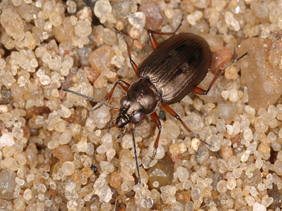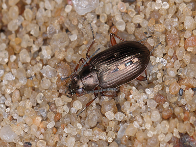 Grünfleck-Ahlenläufer Merkmale: Körper 5 - 6,5 mm. Bronzefarben bis kupferig. Auf jeder Flügeldecke zwei viereckige, meist silberige Flecken. Fühler und Beine bräunlichgelb. Lebensweise: Euro-sibirisches Fauenenelement. Typischer Vertreter der Flussauen. An sandigen und vegetationsarmen Ufern. Vorkommen und Gefährdung: Mitteleuropa bis Sibirien. In RLD als Kategorie 2-Art (stark gefährdet) eingestuft. In RLBB in Kategorie R (extrem selten) geführt. Im Oderbruch an sandigen Ufern der Oder. Beispielnachweise: 08.und 17.05.2021 bei Reitwein (K. Neumann) Literatur: Scheffler et al. 1997, 1999