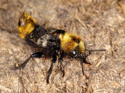 Behaarter Kurzflügler Lebensweise: E.h. besiedelt Weiden, urbane Bereiche, Flussauen, Trockenrasen, Feuchtwiesen. An tierischem Kot (z.B. Rinder) und vermoderten und verpilzten organischen Stoffen. Larven und Imagos jagen Insekten und deren Larven (z.B. Aphodius). Erscheint von April bis August. Bei Gefahr drohen die Tiere mit gespreizten Mandibeln und aufgerichtetem Hinterleib. Thermophil. Vorkommen und Gefährdung: In Deutschland und Brandenburg selten. Große Populationsschwankungen. Durch intensive Landnutzung bedroht. RLD, stark gefährdet (Kat. 2); RLBB, vom Aussterben bedroht (Kat. 1). Im Oderbruch wahrscheinlich weit verbreitet und selten. Neuere Funde: Mallnow (Rössner 2002), Sophientaler Polder (Neumann 2015, 2016, 2017).