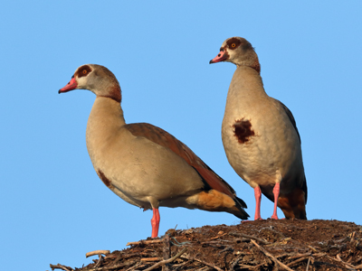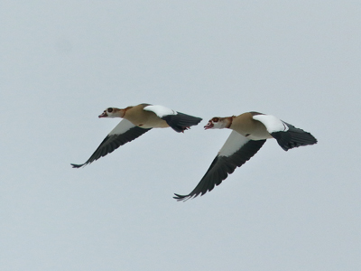 Alopochen aegyptiaca (LINNAEUS, 1766) - Nilgans Merkmale: Große, bunte und langbeinige Halbgans (63 - 73 cm). Oberseite dunkelbraun. Brust mit dunklem Fleck. Im Flug auffälliger weißer Vorderflügel. Großer Augenfleck. Lebensweise: Afrikanische Art. Seit mehreren Jahhrhunderten als Ziergeflügel in Europa gehalten. Seit den 1970er Jahren Ausbreitung über weite Teile Europas. Brütet am Boden, in Baumhöhlen oder in Greifvogel- oder Storchenhorsten. Während der Brutzeit sehr agressiv. Neozoon. Vorkommen und Gefährdung: In Brandenburg erster Brutnachweis 2003. Seit dem deutliche Populationszunahme. Wird im Oderbruch regelmäßig beobachtet. Brutvogel? Beispielbeobachtungen im OB: u. a. 29.04.2017 Güstebieser Loose, 28.04.2019 bei Nieschen, 26.06.2021 Sophienthaler Polder
