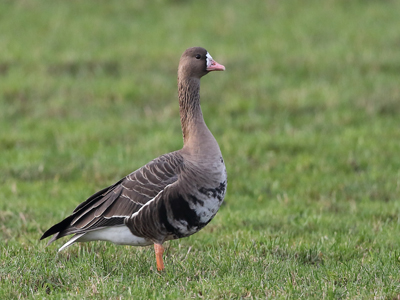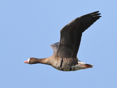 Anser albifrons (SCOPOLI, 1769) - Blässgans Lebensweise: Insgesamt fünf Unterarten, die in den arktischen Gebieten Russlands bis Ostsibirien, im arktischen Nordamerika und auf Grönland brüten. In Eurasien zwei Unterarten A. alb. albifrons und A. alb. flavirostris. In Mitteleuropa häufiger Wintergast und Durchzügler. Ernährung vorwiegend vegetarisch. Sehr stimmfreudig. Vorkommen und Gefährdung: In Brandenburg ist die europäische Unterart A. alb. albifrons regelmäßig und sehr zahlreich während der Zugzeiten und auch als Wintergast zu beobachten. Meist in großer Zahl auf Feldern und Wiesen. Einflug ab Ende September/Oktober und Rückzug im März. im Oderbruch alljährlich in großen Trupps zu den Zugzeiten. Beispielbeobachtungen im OB: 03.02.2018 Güstebieser Loose, 14.02.2021 bei Karlsbiese, 28.03.2021 bei Nieschen (K. Neumann)
