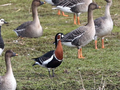 Branta ruficollis (PALLAS, 1803) - Rothalsgans Lebensweise: Brütet im arktischen Teil der russischen Tundra. Nistet in kleinen Kolonien entlang von Flussufern. Überwintert vorwiegend am Schwarzen Meer. Erscheint regelmäßig in Mitteleuropa. Gelegentlich auch Gefangenschaftsflüchtlinge. Vorkommen und Gefährdung: In Brandenburg regelmäßig während der Zugzeiten (insbesondere auf dem Frühjahrszug). Im Oderbruch sehr seltener Durchzügler. Von der IUCN als "gefährdet" eingestuft. Durch Washingtoner Artenschutzabkommen und den Anhang I der EU-Vogelschutzrichtlinie geschützt. Beispielnachweis: 28.03.2021 bei Nieschen (K. Neumann) Literatur: Svensson et al. 1999