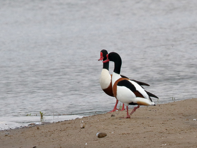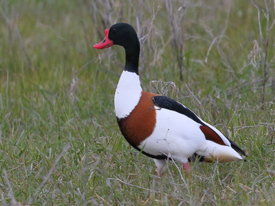 | Brandgans Merkmale: Mittelgroße, kräftige Halbgans (55-65 cm). Charakteristische Färbung. Gefieder weiß mit braunem Brustband, braune Schwung- und Schulterfedern. Schwarze Schwanzfedern und schwarzer Bauchstreifen. Kopf dunkelgrün. Schnabel leuchtend rot. Männchen mit deutlichem Schnabelhöcker. Lebensweise: Brütet an Küsten, größeren Gewässern und Flüssen. Das Nest wird in Erdhöhlen, besonders Kaninchen- und Fuchsbauen angelegt. Kurzstreckenzieher, Teilzieher Vorkommen und Beobachtungen: In Brandenburg Brutvogel an Havel, Oder und Elbe, aber auch abseits der Flüsse. Bestandsentwicklung der Brutpopulation ist positiv. Im Oderbruch Brutvogel und Durchzügler. Beispielbeobachtung: u. a. 29.04.2017 Güstebieser Loose, 28.04.2019 bei Nieschen, 26.06.2021 Sophienthaler Polder Literatur: Svensson et al. 1999, Ryslavy et al. 2019 |