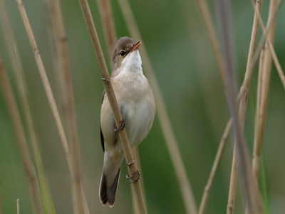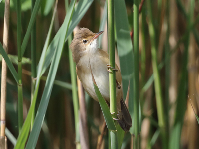 Teichrohrsänger Lebensweise: Brütet in hohen und dichten Schilfbeständen verschiedener Gewässer: Seen, Teiche, Tümpel, Sümpfe und Gräben. Das Nest wird zwischen Schilfhalmen gebaut. Sommervogel. Erscheint im April und verläßt das Brutgebiet im Oktober. Langstreckenzieher. Überwintert in verschiedenen Teilen Afrikas. Nahrung: Insekten. Vorkommen und Gefährdung: In Brandenburg häufiger Brutvogel mit relativ stabilem Bestandstrend. Im Oderbruch Brutvogel. Beispielnachweise: 11.05.2018 bei Nieschen (K. Neumann) Literatur: Svensson et al. 1999, Ryslavy et al. 2019 |
