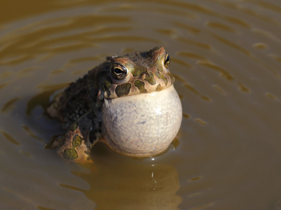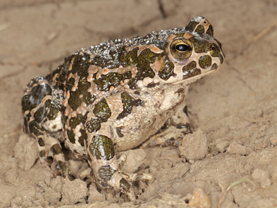 Merkmale: Große Kröte: Männchen 80 - 100 mm, Weibchen 100 - 120 mm. Oberseite grünlich, grau oder braun mit dunkelgrünen Flecken. Unterseite hellgrau, manchmal gefleckt. Deutliche Ohrdrüsen. Iris grünlich mit schwarzen Sprenkeln. Männchen mit Kehlschallblase. Lebensweise: Ökologisch sehr anpassungsförmig u. a. Kulturland, Ödflächen, Offenland. Hält Trockenheit aus. Wärmeliebend. Vorwiegend abends und nachtaktiv, aber auch am Tage. Fortpflanzungszeit April bis Mai. Trillernde Paarungsrufe. In sauberen und verschmutzten, aber sonneexponierten Gewässern. 2 - 4 m lange Laichschnüre mit bis zu 15000 Eiern. Metamorphose nach 2 - 3 Monaten. Überwintert in eigenen oder Fremdbauen (auch mit anderen Tieren) oder unter Steinen. Vorkommen und Gefährdung: In Brandenburg verbreitet und als gefährdet (Kat. 3) eingestuft. RLD Kat. 3. Bedroht durch Verlust temporärer Gewässer und Fischbesatz. Im Oderbruch lokal verbreitet. Literatur: Schneeweiß et al. 2004 |